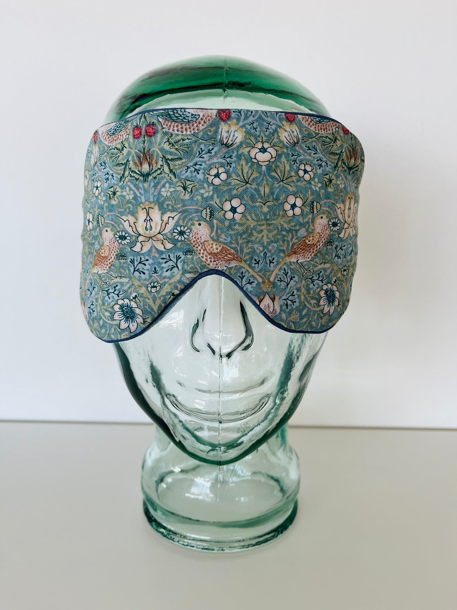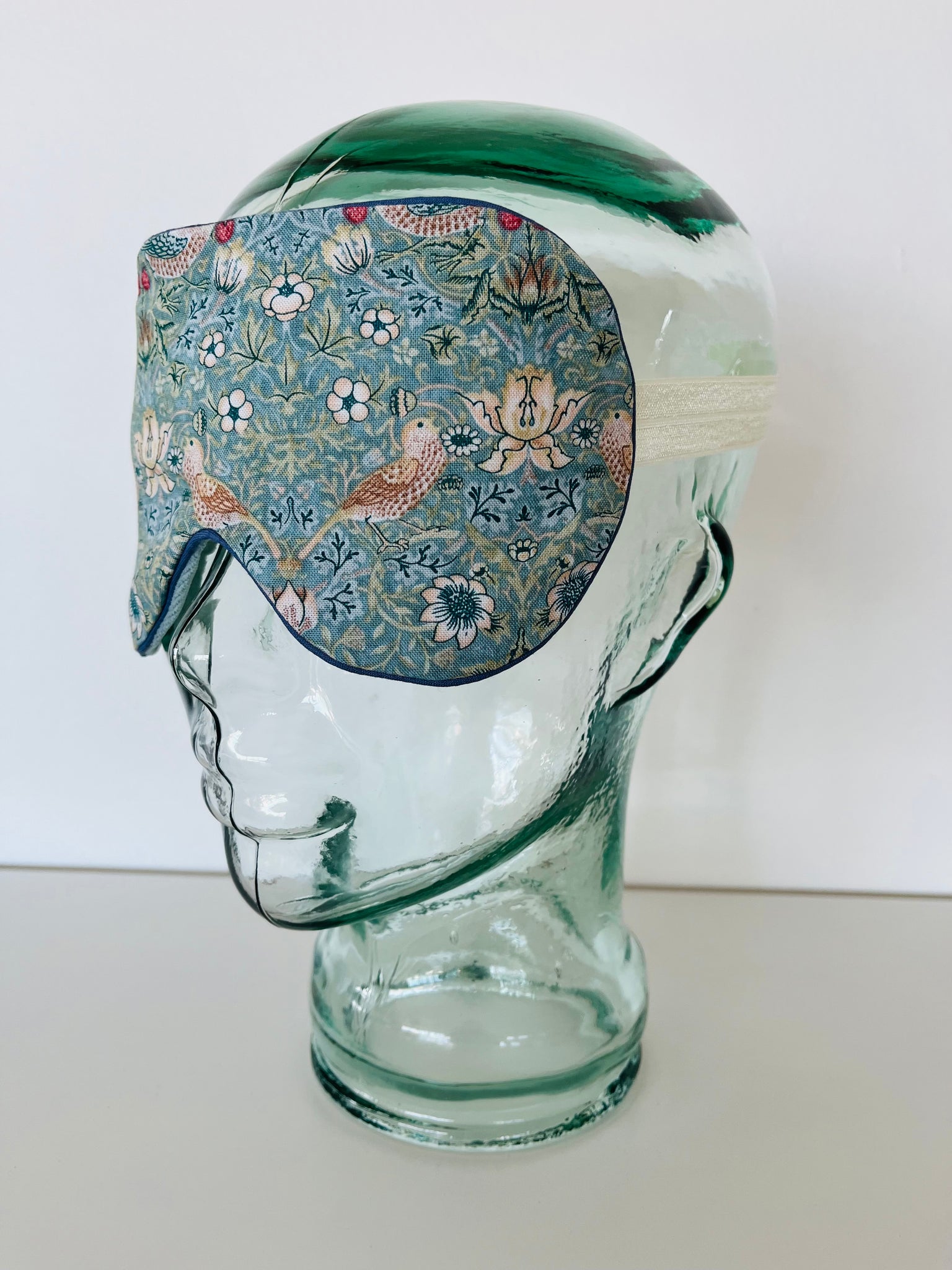 Sove/øjenmaske i William Morris stof, uld i midten, cremefarvet elastikbånd og støvet grøn velour på bagside.